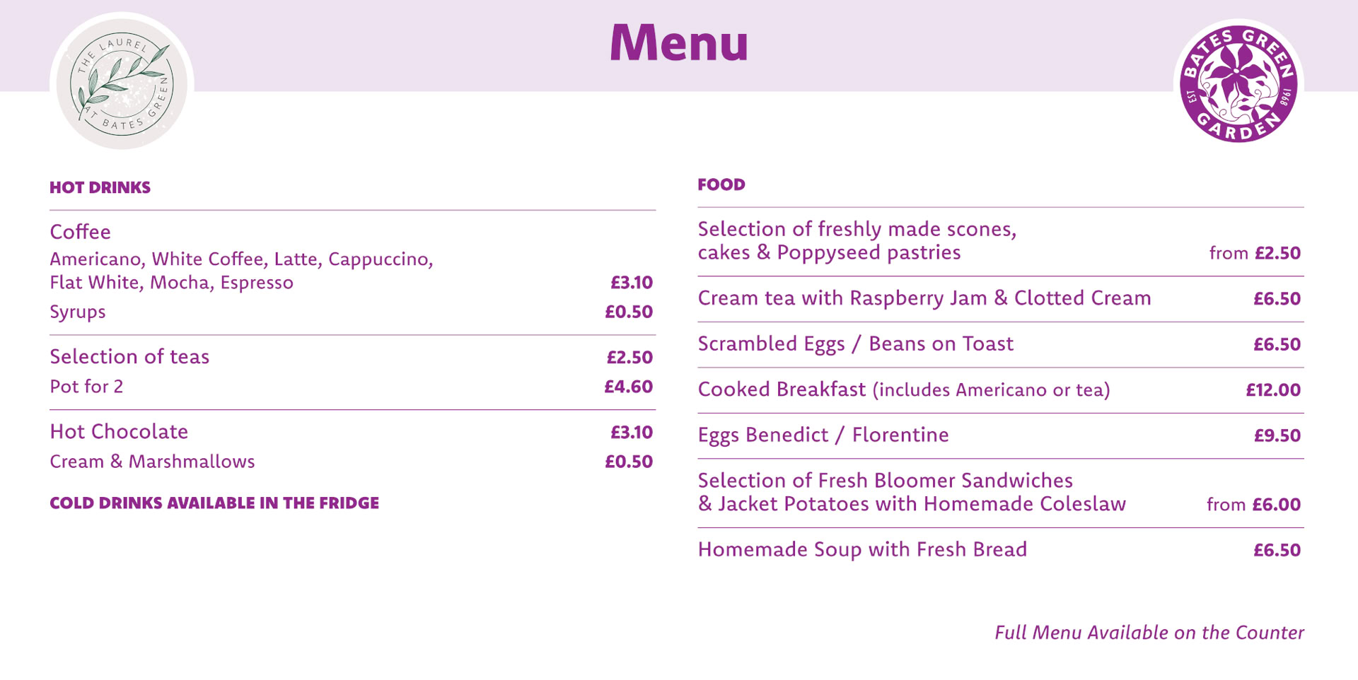Encapsulating the garden theme, there is a smaller version of The Laurel's menu of breakfast, brunch and light lunches as well as a selection of homemade cakes and treats. See below.